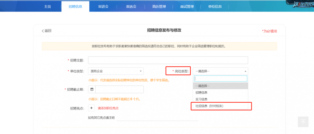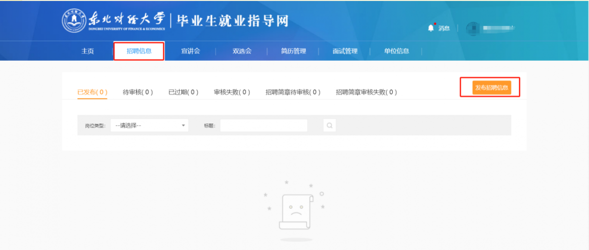 有面向東財校友社會招聘需求的用人單位可在東北財經大學畢業生就業指導網注冊賬號(注:注冊審核通過后可發布校招、社招信息以及預約校招專場宣講會、雙選會,如已有賬號,可直接登錄),在“招聘信息”模塊選擇“發布招聘信息”,“崗位類型”選擇“社招信息(針對校友)”,并根據網站指引完成招聘信息錄入,經學校招生就業處審核后即可發布在畢業生就業指導網以及微信公眾號相應模塊。
