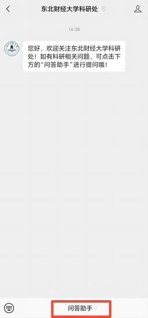 關(guān)注公眾號“東北財經(jīng)大學(xué)科研處”,點擊“發(fā)消息”按鈕后,進(jìn)入聊天界面,點擊下面的“問答助手”即可進(jìn)入“AI助手”問答界面。如下圖所示: