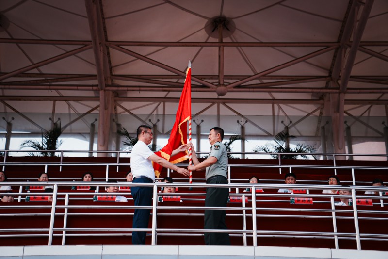 劉險(xiǎn)峰向?qū)W校2025級(jí)本科生軍訓(xùn)團(tuán)授團(tuán)旗。